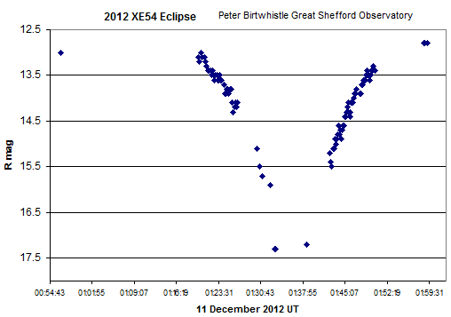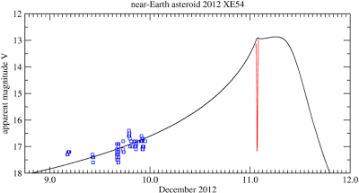 The plot below shows the expected average apparent magnitude of asteroid 2012 XE54 (line), the filter-corrected magnitudes reported (blue boxes) and the dip due to the eclipse (red curve).