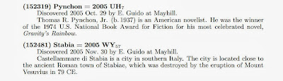 The Minor Planet Circular MPC 85415- 85916 issued on November 20, 2013 announces that asteroid 152319 (2005 UH7) is now officially named "Pynchon" and the asteroid 152481 (2005 WY57) is now officially named "Stabia". I choosed asteroid "Pynchon" to honor great American novelist Thomas Pynchon known almost exclusively through his writing, dense and complex. While asteroid "Stabia" honors the city of Castellammare di Stabia in Italy where I was born.