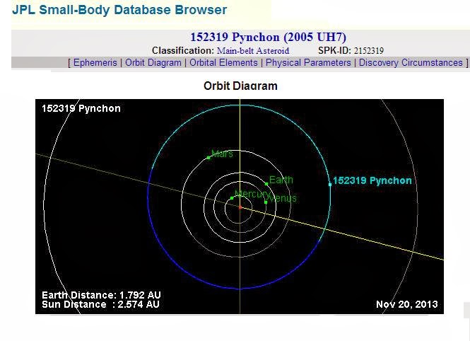 Asteroid "Pynchon" resides in the Main Asteroid Belt, between Mars and Jupiter, of the Solar System; with an estimated size about 2 km - 4 km, it takes 4.10 years to complete a revolution around the Sun.