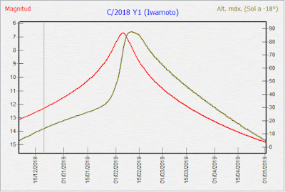 Below you can see a graph generated using the software Orbitas and showing the predicted magnitude (in red) versus the maximum height (for Northern Hemisphere). (click on the image for a bigger version). Preliminar orbit has the comet 0.2 AU from Earth with a peak magnitude of about 6 at the beginning of February 2019! (as always with comets, the future magnitudes reported here are only indicative). Elongation at the beginning of February 2019 will be 160 degrees (maximum height will be very good for Northern Hemisphere at peak that is around 80 degrees, good for Southern until few days before peak then decreasing fast).