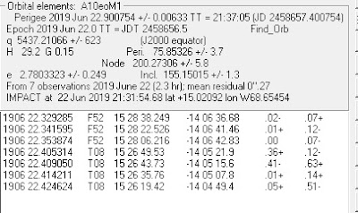 Davide Farnocchia at JPL noticed "that the T08 NEOCP observations could generate an impact prediction matching the observed point and time on the earth of a fireball recorded on June 22 at about 21:30UT. That led to an orbit - this is where A10eoM1 would have been, based on the four ATLAS observations and assuming it really was this particular impactor - good enough to do precovery searches through the PanSTARRS data (F52 Mpc code)." (via Bill Gray, private communication).