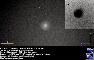 Cbet No. 3674, issued on 2013 October 21, reports an outburst in brightness of comet C/2012 X1 (LINEAR). The magnitude of the comet was measured by H. Sato on on Oct. 20.5 to be total mag 8.5 (as measured within a circular aperture of diameter 85".2) with a brighter center about 10" across. The predicted H_10 magnitude for C/2012 X1 (LINEAR) would be around 14 now.
